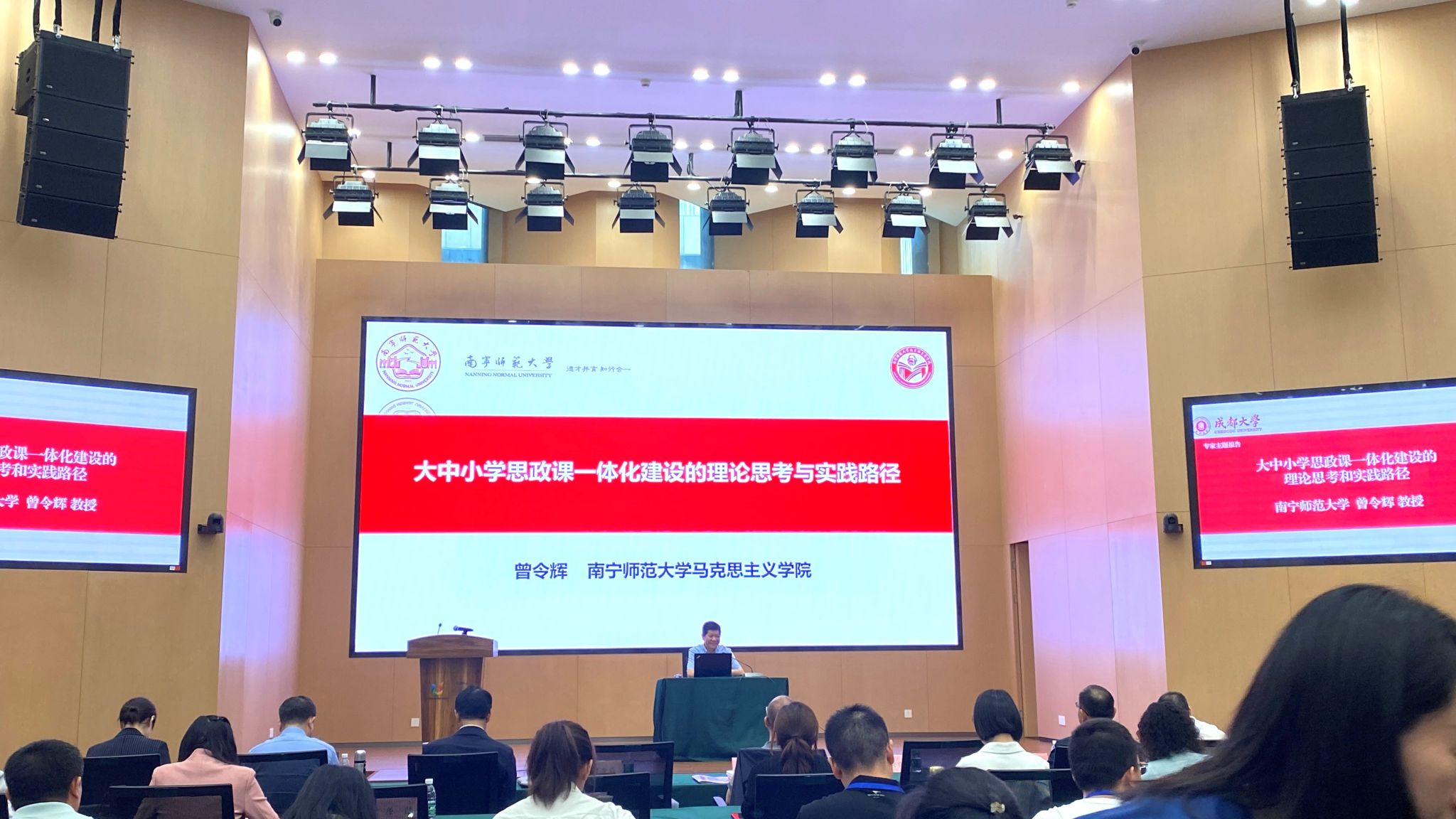 本次会议聚焦大中小学思想政治教育一体化建设发展主题。会上,中国教育发展战略学会思想道德建设专委会理事长、北京师范大学思想政治工作研究院院长冯刚教授以“深化大中小学思想政治教育一体化的环境建构”为题作主旨报告,深入探讨了大中小学思想政治教育一体化环境建构的价值意蕴、时代特征和推进策略。曾令辉院长在专家主题报告阶段做了题为“大中小学思政课一体化建设的理论思考和实践路径”的主题报告,曾院长从大中小学思政课一体化“为什么化”“化什么”“怎么化”三个角度展开讨论,从理论层面和实践层面全面阐述了当前大中小学思政课一体化发展面临的现实问题,指出推进大中小学思政课一体化教学改革创新不是零散的“化”,而是推进全方面、全过程的整体“化”,重点提出了以“育人共同体”“知识链”“能力链”和“价值链”为核心的“一体三链”育人新体系,同时向与会领导和专家学者介绍了广西壮族自治区各市大中小学各学段思政课主题教学的开展情况和取得的成效。报告受到与会领导和专家学者们的高度认可和赞誉。