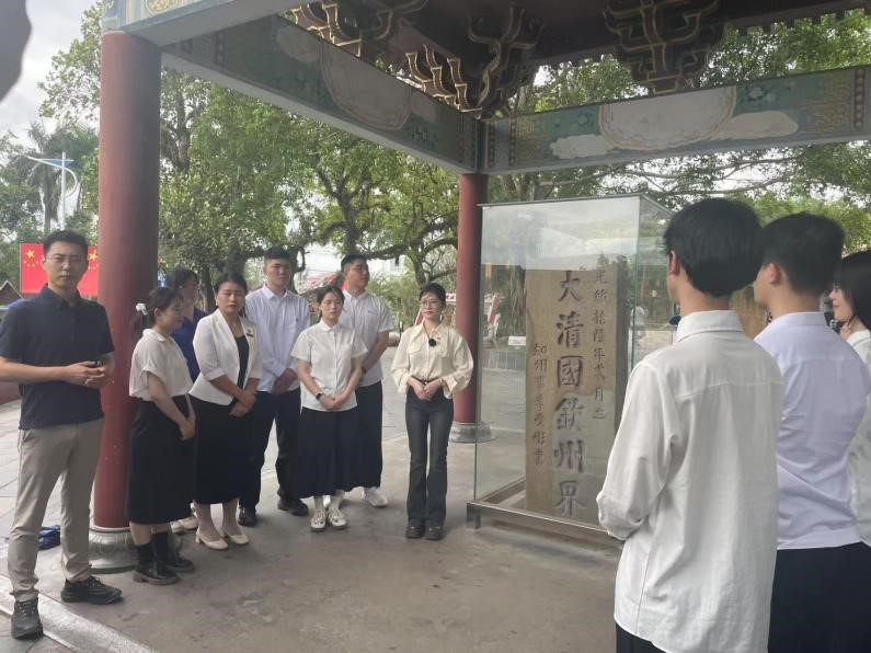 首站,师生们来到东兴市“大清国钦州界”界碑处。防城港职业技术学院黄琼锌老师以《界碑前的忠诚——爱国精神、民族团结的传承》为主题展开教学。界碑上斑驳的刻痕,宛如一部无言的史书,默默诉说着过往的风雨。黄老师从界碑划定的历史背景讲起,深入阐述其在维护国家领土主权完整中所扮演的重要角色,将一段段真实的历史如画卷般铺展在师生眼前。同学们近距离触摸界碑,深刻认识到每一寸国土都凝聚着先辈的心血,捍卫国家领土主权完整是每个中华儿女义不容辞的责任。现场,学生们纷纷表示,此次实地学习让他们对国家主权和边境历史有了更直观、更深刻的认知,今后定当发奋学习,为祖国的繁荣昌盛贡献自己的青春力量。
