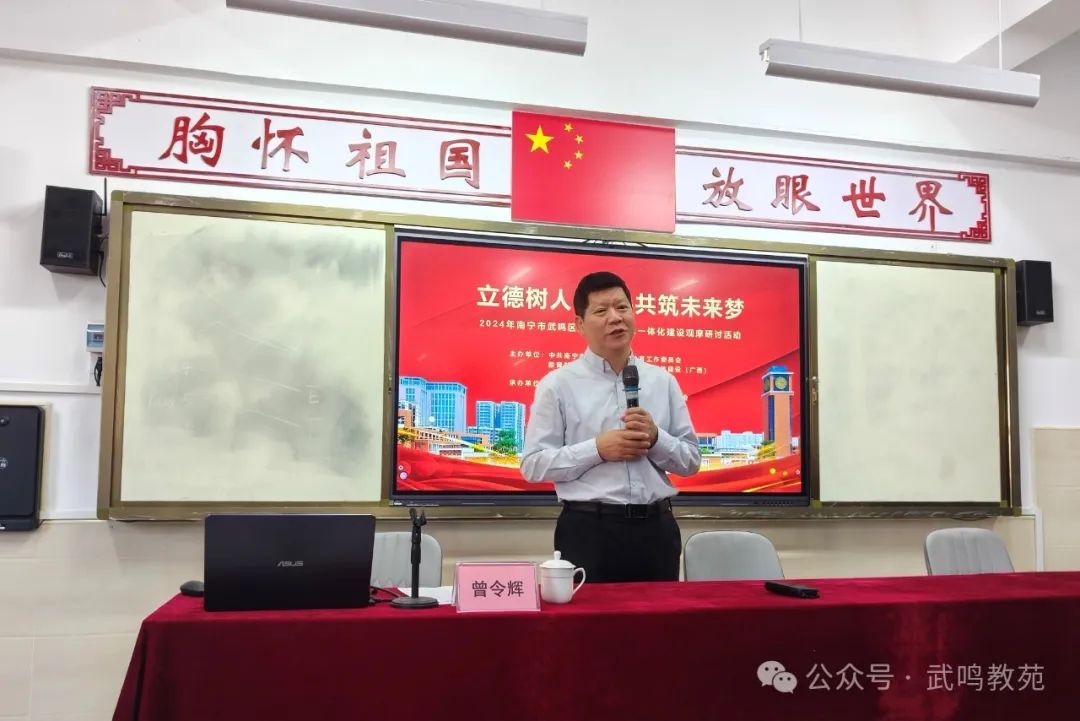 联合举办大中小学思政一体化建设观摩研讨活动,开创了武鸣区教育系统“党、团、队一体化建设”和大中小学思政教育一体化建设新格局,是武鸣区贯彻落实习近平总书记关于对学校思政课建设作出的重要指示和党的二十届三中全会、全国教育工作大会精神的重大举措之一。他希望思政教育工作者以此次活动为契机,深刻领会大中小思政一体化建设“三个一”:一是明确一个态度。要深刻认识思政课的重要意义,明确自身肩负重担,坚守思政课堂阵地,引导广大青少年“坚定前进信心,立大志、明大德、成大才、担大任,努力成为堪当民族复兴重任的时代新人”。二是传递一个声音。扎实落实习近平总书记提出的“八个统一”的具体要求,通过综合运用案例式教学、探究式教学、互动式教学、专题式教学等多种形式,探索运用现代科技手段,努力拓展学习时空,让思政教育更加温暖鲜活,可亲可信,真正走进学生心里。三是形成一种共识。要不断学习提升,做到政治强、情怀深、思维新、视野广、自律严、人格正,争做“大先生”、教“大学问”、育“大英才”,不断释放武鸣区思政教育新局面的强大动能。
