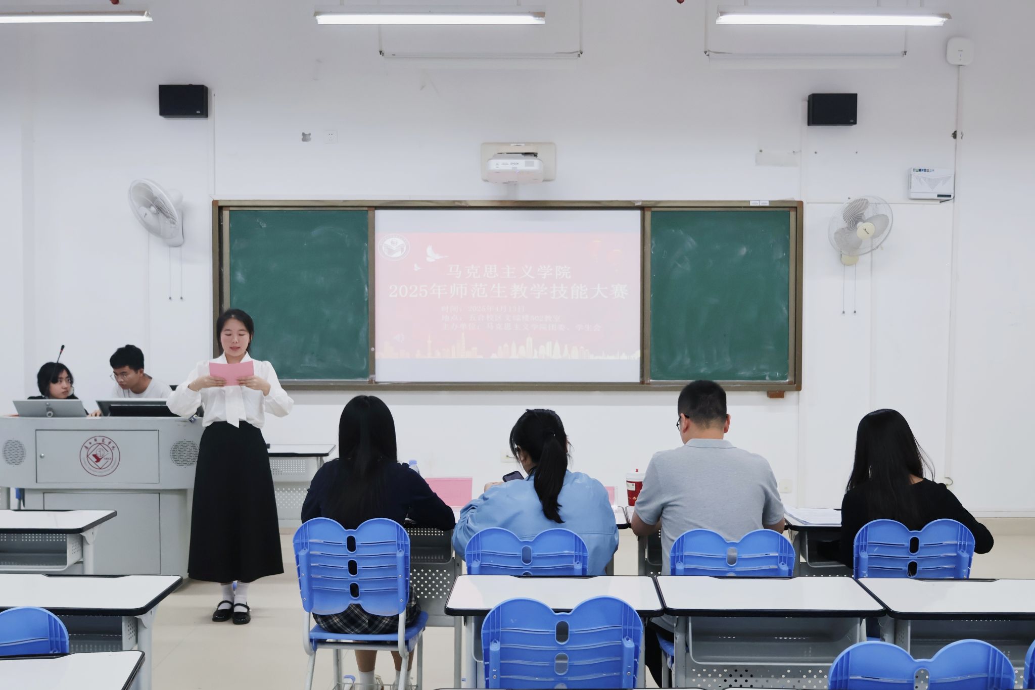 于4月13日在文综503、502教室举办了2025年师范生教学技能大赛初赛。出席本次大赛的评委有教师代表林志婷、冯舒讌、徐欣、周韦力,学生代表奚潇健、陈泓霖、黎蓉、邓仁津。