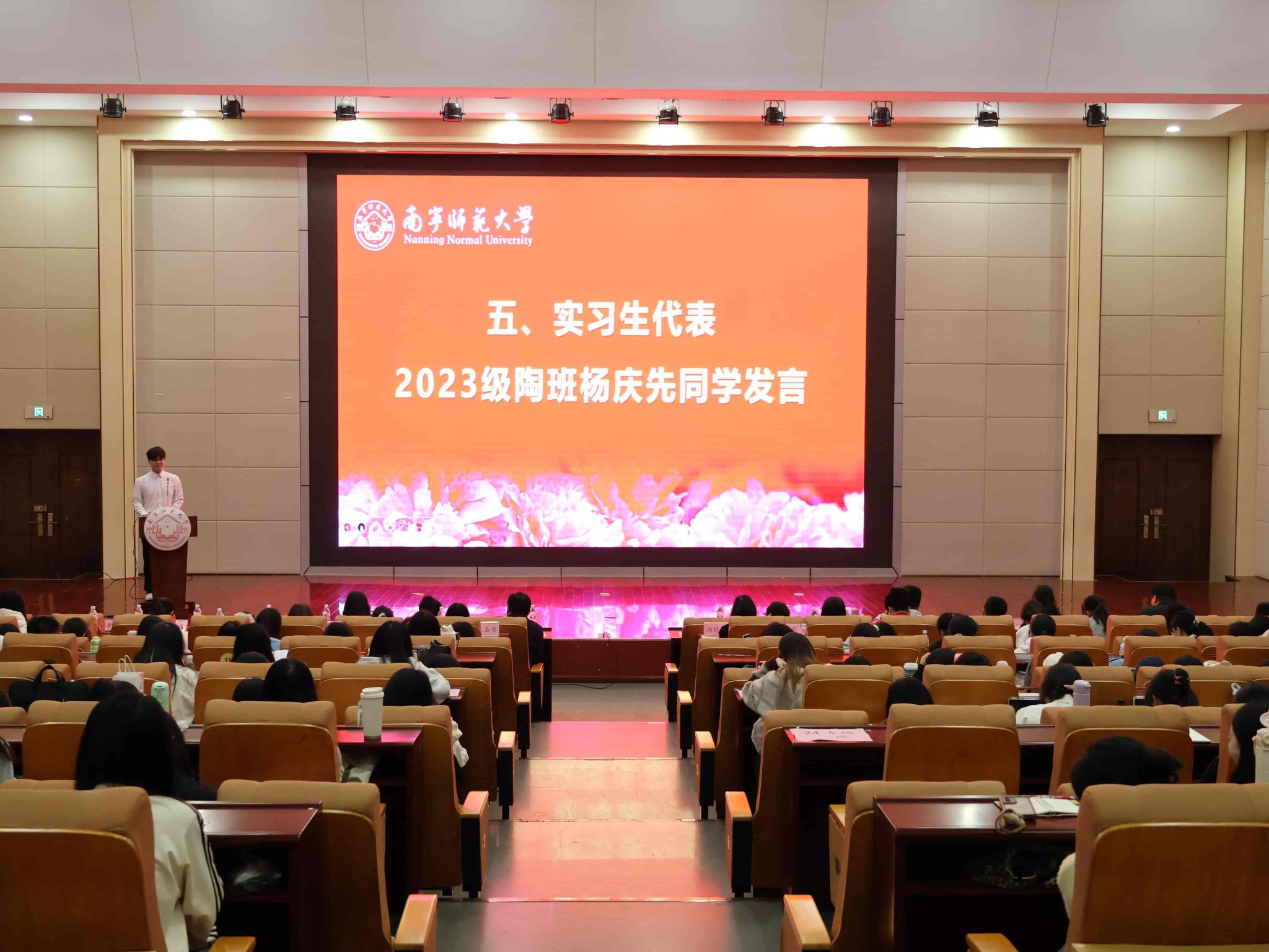 2023级陶行知实验班杨庆先同学作为实习生代表发言。他首先感谢学院提供宝贵的实习机会和平台,表达了全体实习生对实习的期待和重视,并表示将严格遵守实习纪律,认真完成各项任务,以实际行动展现马院学子的良好风貌。