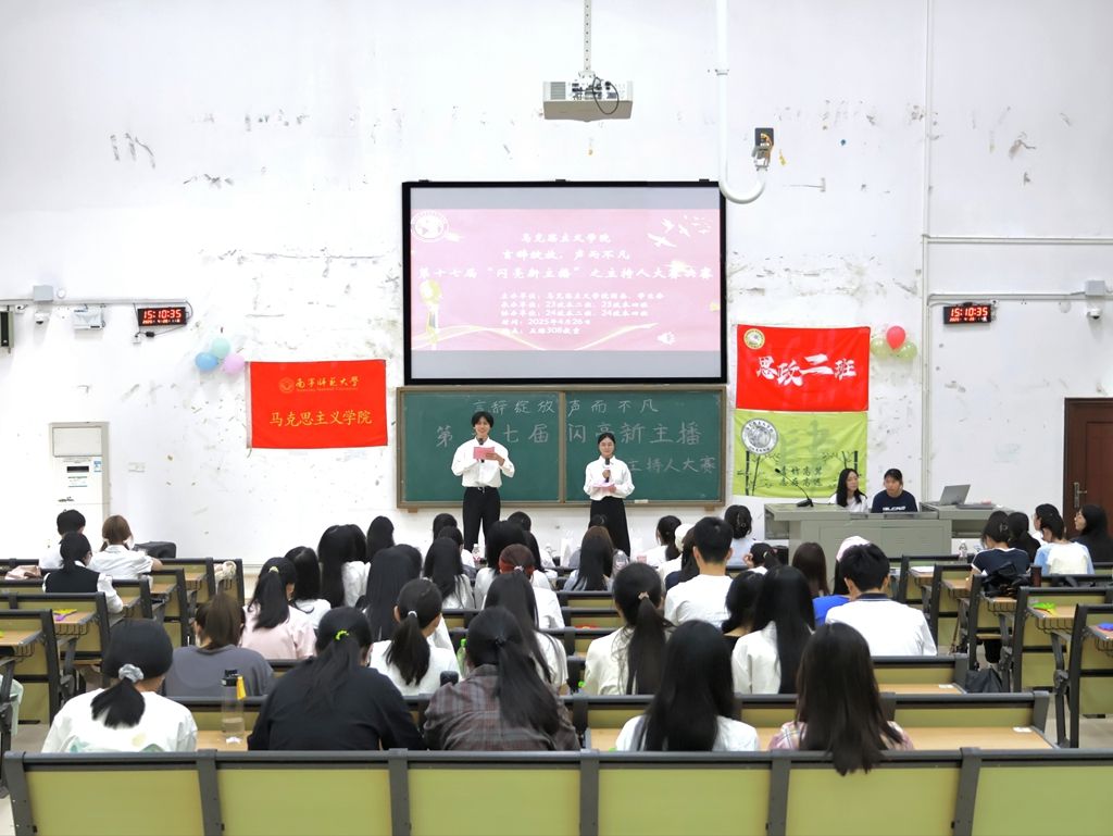 于4月26日在五综308教室举行第十七届“言辞绽放声而不凡”闪亮新主播主持人大赛决赛。23级思政二班班主任王茜老师、23级思政四班班主任梁晓罕老师等多位师生代表担任嘉宾评委。