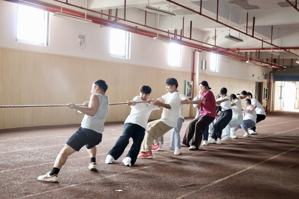 拔河比赛率先开场,随着裁判员一声清脆的哨响,双方队员迅速握紧绳索,双脚蹬地,身体后倾。整齐的口号声在场馆内响起,队员们集中发力,全力以赴争取胜利,展现出高度的团队协作意识和竞技专注度,这不仅是力量的较量,更是团队精神与凝聚力的彰显。