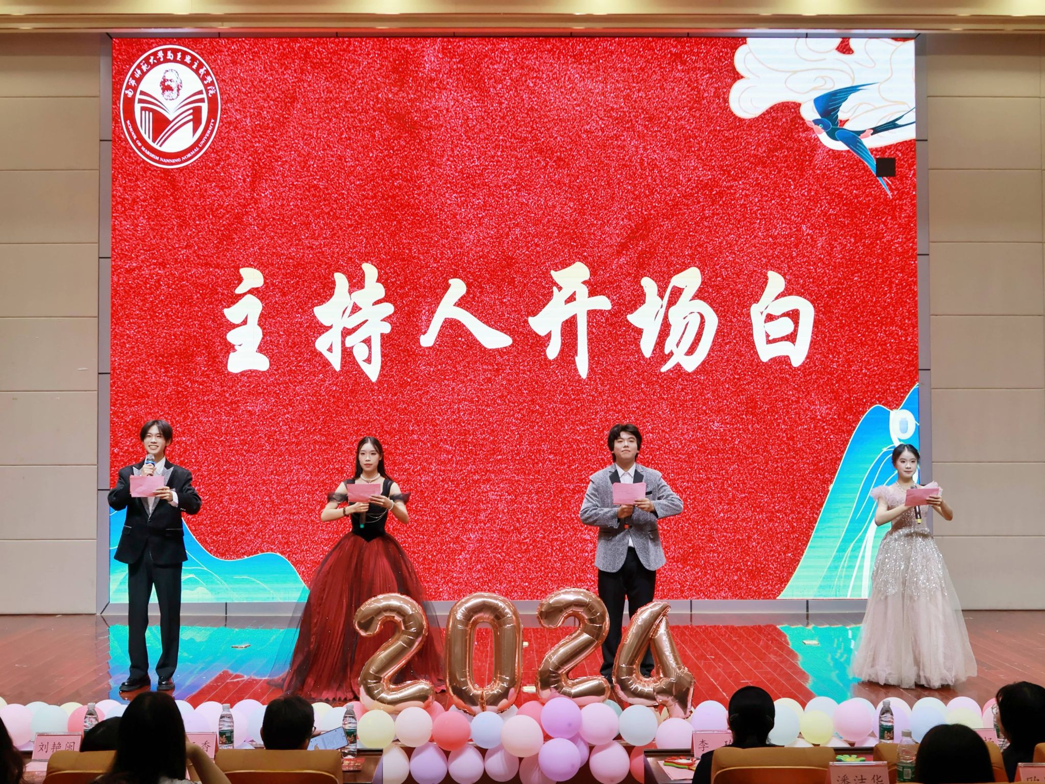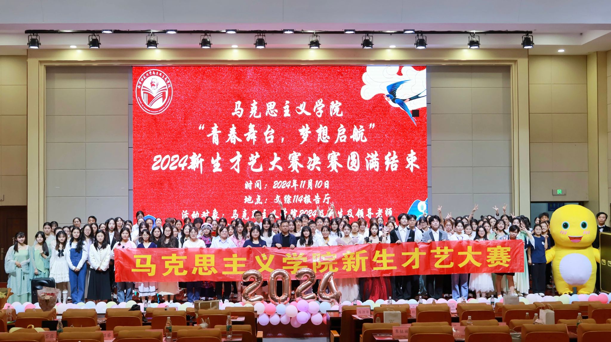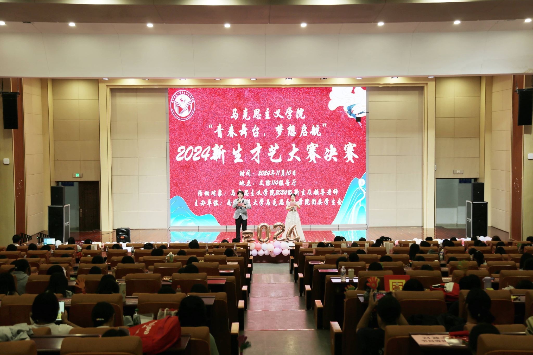 于11月10日在文综114报告厅举办了2024级新生才艺大赛决赛。出席本次新生才艺大赛的领导老师有学院党委书记李玲、党委副书记黄志海、团委书记韦旖扬、辅导员王玉香、24思政4班班主任刘艳闽、24思政5班班主任林志婷以及化学与材料学院辅导员刘杨等。各院代表、文体部负责人、24级各班助班和24级新生等也来到现场观赛。