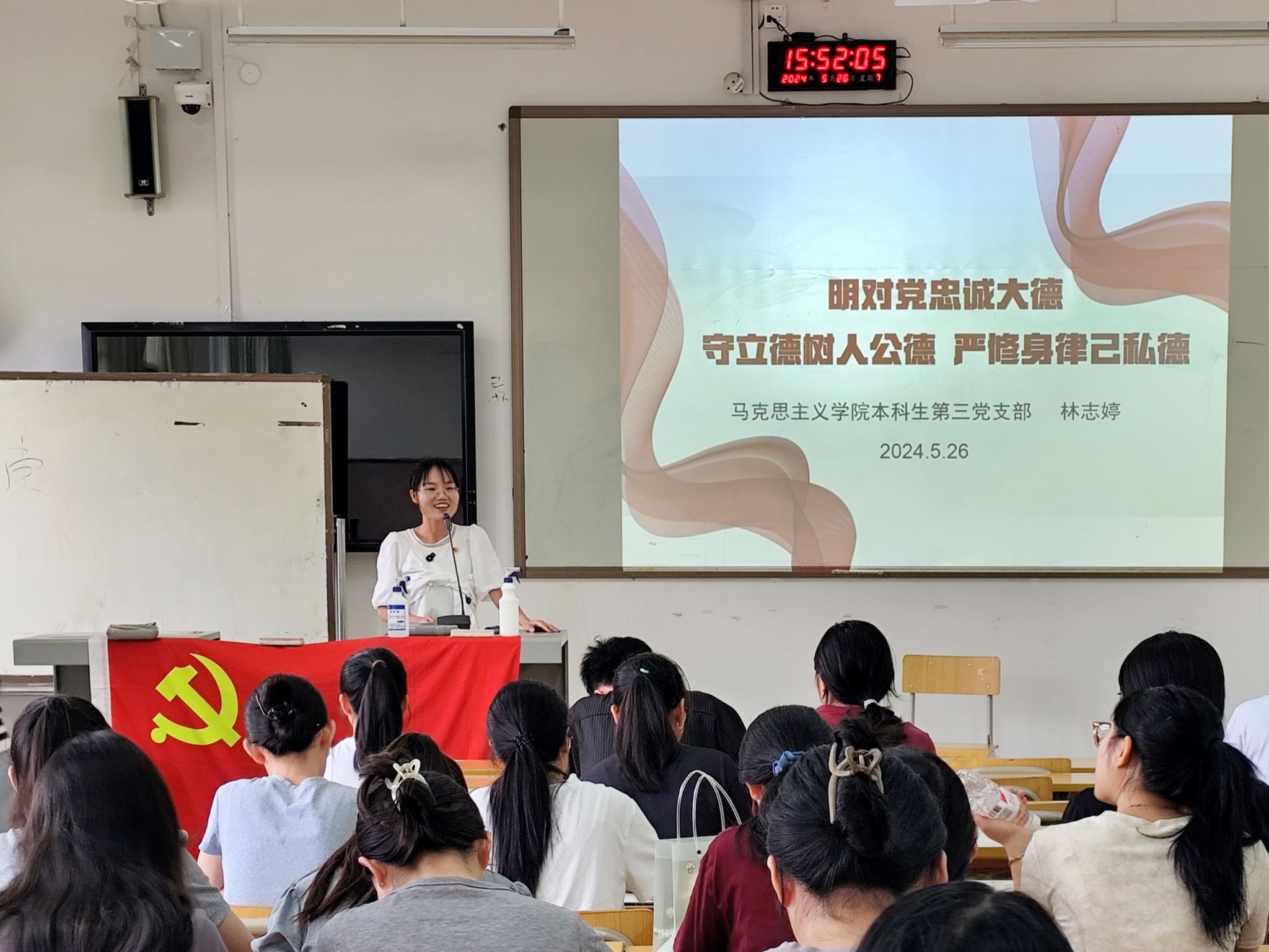 活动伊始,由张万景老师讲授《以严的标准遵守党的各项纪律》专题党课,他指出,遵守党的纪律,关键在从严,树立严的标准,就要坚持纪严于法、坚持问题导向、坚持以上率下,对党员而言,严守纪律规矩既是一个加强自我改造的永恒课题,更是一场勇于自我革新的精神之战。紧接着,林志婷老师讲授《明对党忠诚大德 守立德树人公德 严修身律己私德》专题党课,她强调党员同志要在党纪学习教育中增强道德定力,不断加强自身的道德修养。林志婷老师立足大学生党员视角,为在场的党员同志介绍了苏蔓、罗文坤、张海萍、张桂梅和龚全珍等优秀党员的先进事迹,呼吁支部党员同志向他们学习。随后,在场党员集体观看中央纪委国家监委对中央党史和文献研究院副院长黄一兵的专访——《加强纪律建设是全面从严治党的治本之策》。本次活动的最后,各个党小组还分享了今天的纪律党课和主题党日活动中的学习感悟,同志们都表示将自觉做到学纪、知纪、明纪、守纪。